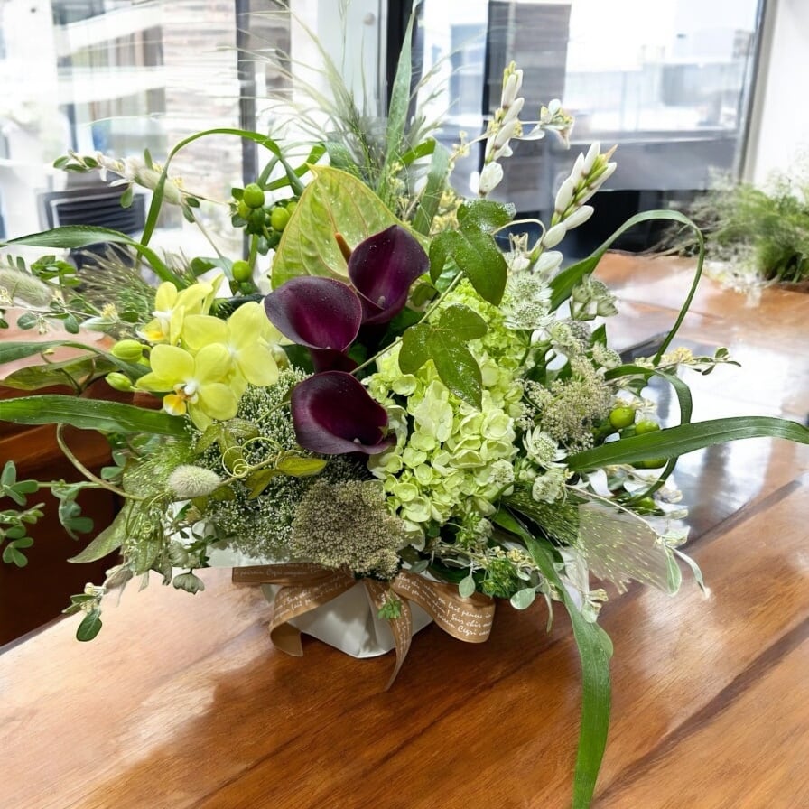 生花アレンジメント【素敵にカッコ良く】Mサイズです!洗練されたデザインと美しい色合いで、特別なシーンを演出します。